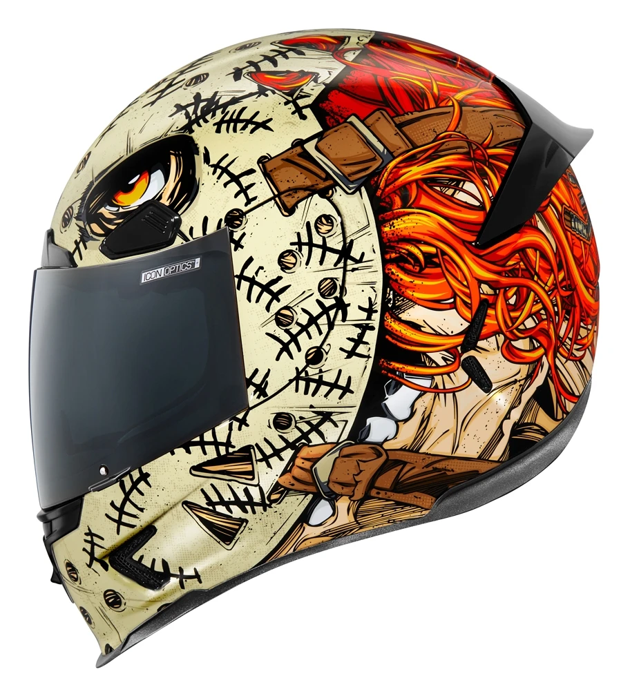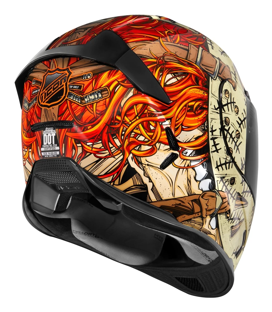 The modern riding position of higher rear sets and lower clip-ons has dramatically altered how a rider interacts with the modern motorcycle. Compressed into an ever more compact shape, the rider’s head positioning requires an increased angle to maintain visibility and stability. The Icon Airframe Pro Helmet has been built on this singular design focus which allows Icon to realize opportunities to decrease drag and weight by sculpting the traditional neckline to avoid jacket or suit interference. The Icon Airframe Helmet’s aggressive geometry increases the line of sight while improving aerodynamic attitude in a fully-tucked riding posture.