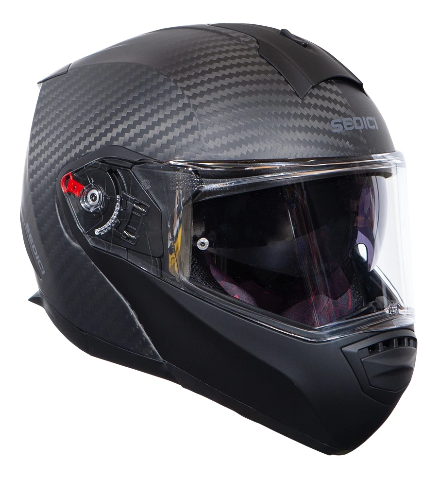 Now in its second iteration, the Sedici Sistema 2 Carbon Modular Helmet returns with improved features and performance in a sleek, heavily revised package. The 6k carbon fiber shell is molded into an aerodynamic shape for reduced turbulence and lift, creating a comfortable high speed riding environment. The Sistema 2 Carbon’s vent scheme and remapped EPS air channels route fresh air from front intake vents to rear exhaust ports – keeping the rider cool at all speeds. A stronger, re-engineered hinge and post mechanism for the modular chin bar helps the helmet achieve overall DOT and ECE safety certifications. Â